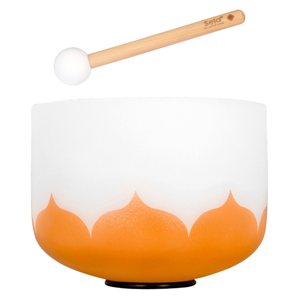 Das orangene 10″-Modell ist auf das Sakral-Chakra ausgerichtet und auf die Note D gestimmt. Bei der 432-Hz-Variante liegt der Kammerton A aber nicht auf der westlichen Standardfrequenz von 440 Hz, sondern bei 432 Hz. Dieser Stimmung wird unter anderem eine besonders entspannende und beruhigende Wirkung nachgesagt. Allerdings harmoniert diese Klangschale dadurch nicht mit herkömmlich gestimmten Instrumenten. Sie sollte entweder einzeln oder zusammen mit anderen 432-Hz-Instrumenten – wie etwa unseren Sela Unity Handpans – gespielt werden.