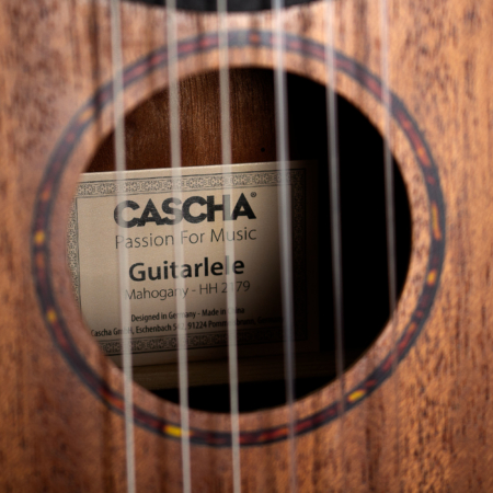 Die Cascha Guitarlele ist – wie der Name schon verrät – eine Mischform aus Gitarre und Ukulele. Rein optisch erinnert sie an eine Ukulele, sie besitzt aber sechs Saiten wie eine Standard-Gitarre und nicht nur vier (wie die Ukulele). Mit einer Gesamtlänge von 73 cm fällt sie etwas größer als die typische Tenorukulele aus. Die Mensur von 43 cm entspricht der einer 1/8-Konzertgitarre für Kinder, allerdings wird die Guitarlele anders gestimmt – und zwar eine Quinte höher. Durch das Tuning auf E-A-D-G-H-E ergibt sich auch ein deutlich höherer Klang, der für das typisch hawaiianische Flair einer Ukulele sorgt.