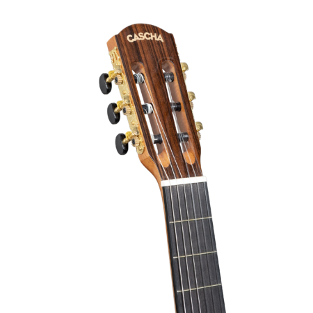 Die verwendeten Hölzer verleihen der CASCHA Performer Series Konzertgitarre Solid Top 4/4 nicht nur überragende akustische Eigenschaften, sondern in Verbindung mit dem Hochglanz-Finish auch einen edlen, traditionellen Look. Dieser wird durch schicke Holz-Inlays am Resonanzloch sowie den Rändern von Decke, Boden und Zarge (sog. Bindings) zusätzlich unterstrichen. Die präzisen Stimmmechaniken sorgen für eine hohe Stimmfestigkeit und sind dank der offenen Bauweise mit goldenen Details ebenfalls ein echter Blickfang. Wie alle Modelle der CASCHA Performer Series besitzt auch dieses Modell einen eingebauten Halsspannstab, mit dem sich die Saitenlage perfekt einstellen lässt.