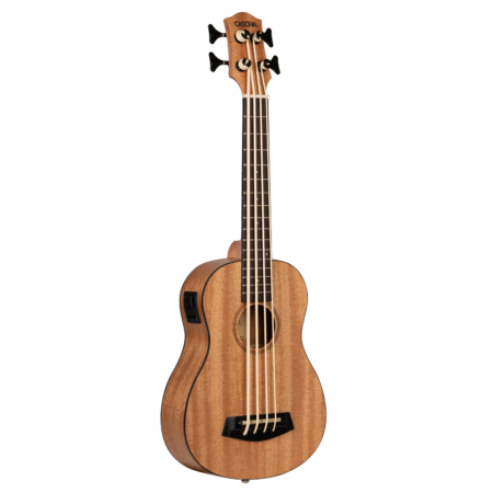 Der Korpus der Cascha Bass-Ukulele besteht vollständig aus laminiertem Mahagoniholz. Dies verleiht ihr einen warmen und vollen Klang. Der Hals ist aus Okoume gefertigt, das Griffbrett aus Schwarzholz. Flotte Notenabläufe gehen durch die kompakten Bundabstände leicht von der Hand. Die Aquila Thundergut Saiten sorgen dabei für enormen Tiefendruck. Sie überzeugen durch ein angenehmes Spielgefühl und haben eine kontrabassartige, markante Ansprache. Bass-Ukulelen werden in der Stimmung E-A-D-G (der typischen E-Bass-Stimmung) gespielt. Die hochwertigen schwarzen Open Geared-Mechaniken sorgen für eine hohe Stimmfestigkeit und arbeiten dabei sehr präzise. Bei Bedarf kann die Ukulele mit Hilfe des integrierten Tuners nachgestimmt werden. Mit dem eingebauten Halsspannstab kann die Saiten-Lage perfekt eingestellt werden.