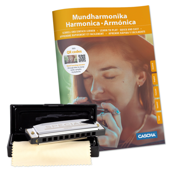 Das ideale Set mit Special Blues Mundharmonika in C-Dur und 4-sprachiger Schule