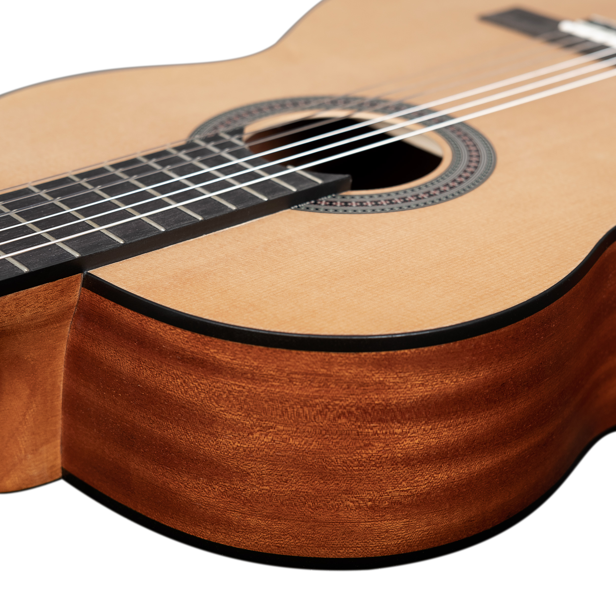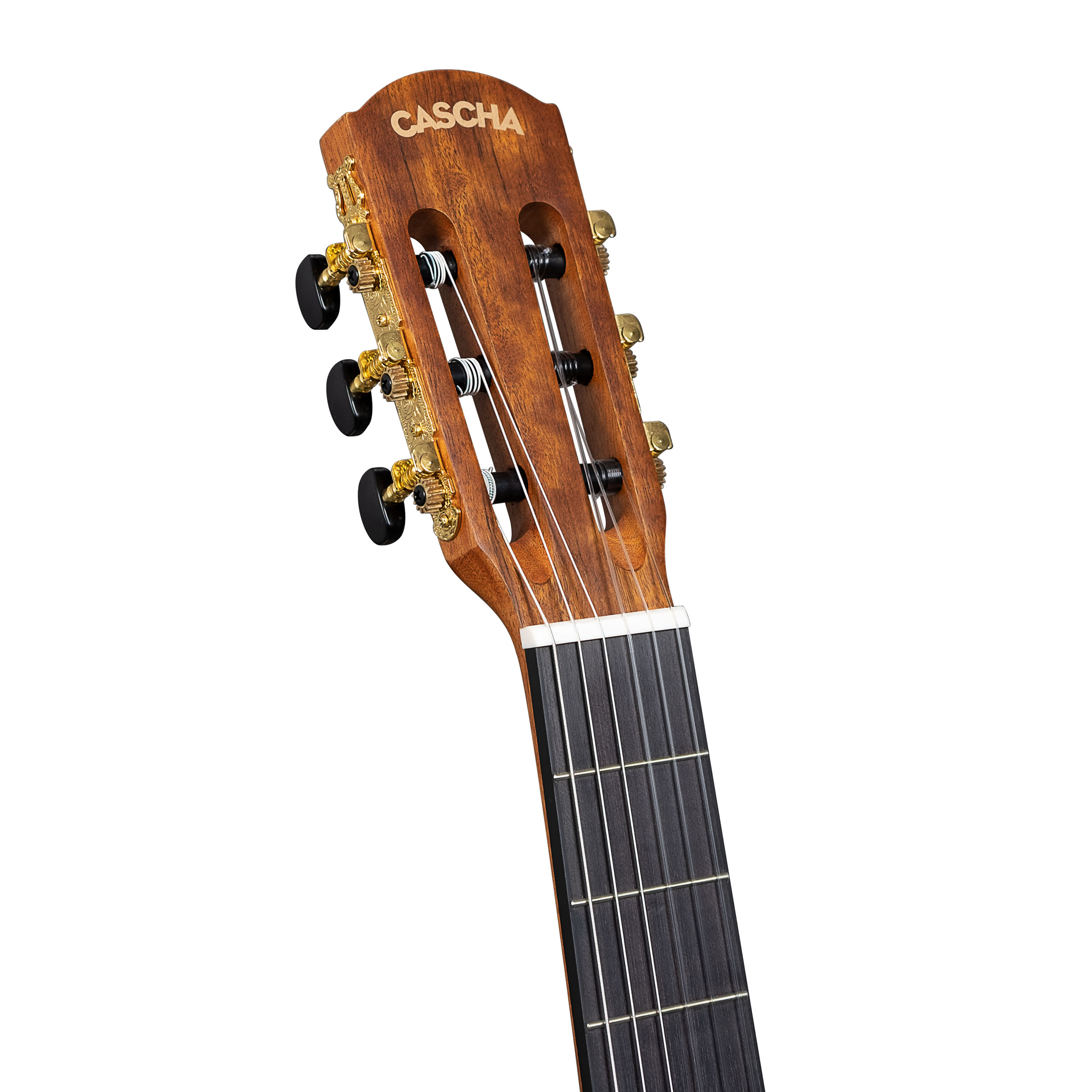 Die CASCHA Stage Series CGC 200 3/4 ist eine klassisch geformte Konzertgitarre mit einer verkürzten Mensur von 58 Zentimetern (36 Zoll). Ausgewählte Klanghölzer sorgen bei diesem Modell für einen vollen, warmen Klang mit langem Sustain. Die Decke der Gitarre besteht aus laminiertem Fichtenholz, der Boden und die Zarge sind ebenso wie der Hals aus hochwertigem Mahagoni gefertigt. Griffbrett und Steg bestehen aus widerstandsfähigem Amaranth (Purple Heart).
